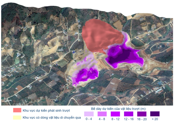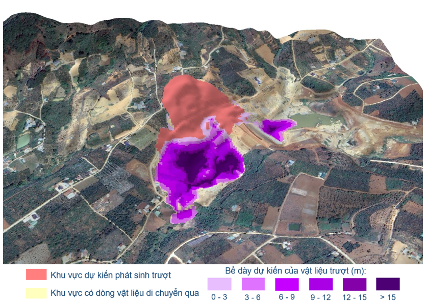 Kết quả điều tra, khảo sát đã xác định được hai khu vực có nguy cơ rất cao xảy ra là T1 và T2. Đây là các khu vực có địa hình dốc, cấu trúc tầng yếu, với sự hiện diện của lớp phủ phong hóa bở rời, khả năng thoát nước kém, dễ bị mất ổn định khi bão hòa nước hoặc chịu tác động của các yếu tố kích hoạt như mưa lớn kéo dài hoặc rung chấn động đất. Trên cơ sở dữ liệu của các khối trượt đã được khoanh định, nhóm nghiên cứu đã chuyển đổi và chuẩn hóa thành mô hình 3D, làm đầu vào cho mô hình mô phỏng trượt lở LS-RAPID, hỗ trợ đánh giá nguy cơ, phân tích tính bất ổn và xây dựng các kịch bản cảnh báo sớm trong điều kiện cụ thể của khu vực nghiên cứu.
